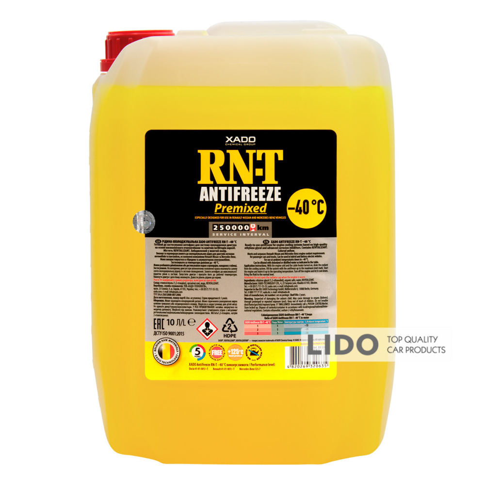 Концентрат охлаждающей жидкости премиум-класса для высокотехнологичных двигателей XADO Antifreeze RN-T на основе этиленгликоля с нанокомпонентом REVITALIZANT.