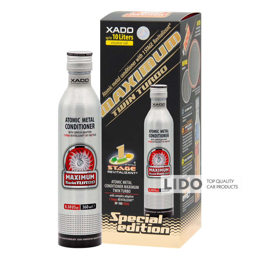 XADO Maximum Twin Turbo — 4-компонентный продукт с расширенными регенерационными свойствами. Сочетает преимущества атомарного кондиционера металла и нанокомпонента REVITALIZANT® 3-е поколение.