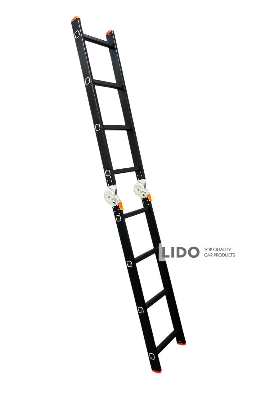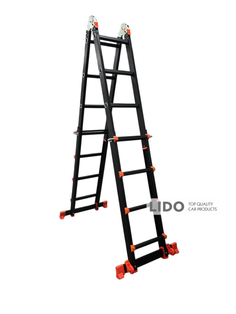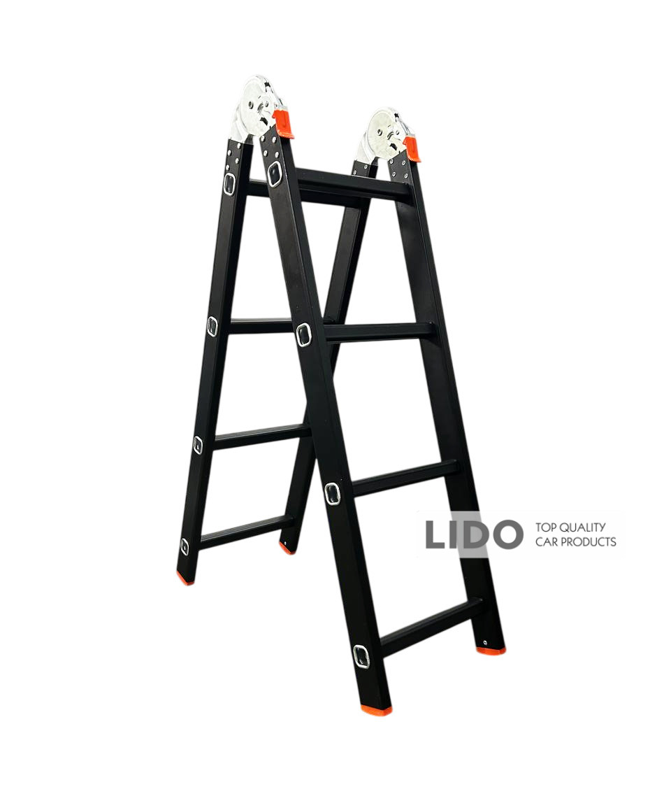 Лестница трансформер телескопическая GTM KMP404D — легкая и прочная алюминиевая конструкция, предназначенная для регулярного промышленного и бытового использования. Профиль изготовлен из авиационного алюминия с переменной толщиной стенки и дополнительно усилен ребрами жесткости, что обеспечивает высокую надежность и стойкость к нагрузкам. Корпус окрашен в черный цвет методом электрофореза для дополнительной защиты от механических повреждений.