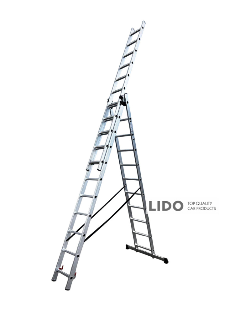 Универсальные 3-секционные лестницы GTM — это надежные и многофункциональные лестницы, которые можно использовать как приставные или выдвижные стремянки, а также как стремянки. Усиленный профиль, ступени с антискользящим покрытием, дополнительный стабилизатор и надежные металлические фиксирующие замки обеспечивают безопасность при использовании.