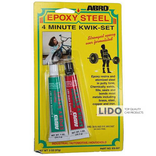Клей ABRO содержит эпоксидные смолы и измельченную сталь. Применяются эпоксидные клеи для химической сварки, заполнения, герметизации и склеивания дерева, пластика и большинства металлов, включая латунь, сталь, медь, железо и т.п. Эпоксидный клей надежно склеивает и обеспечивает хороший внешний вид. Устойчив к бензину, антифризу и большинству растворителей. Эпоксидный клей может применяться для сломанных велосипедов, растрескавшихся картеров коробки, тормозных колодок, всасывающих труб, поврежденных шпоночных канавок, трещин в обшивке, растрескавшейся батареи, бензобаков.