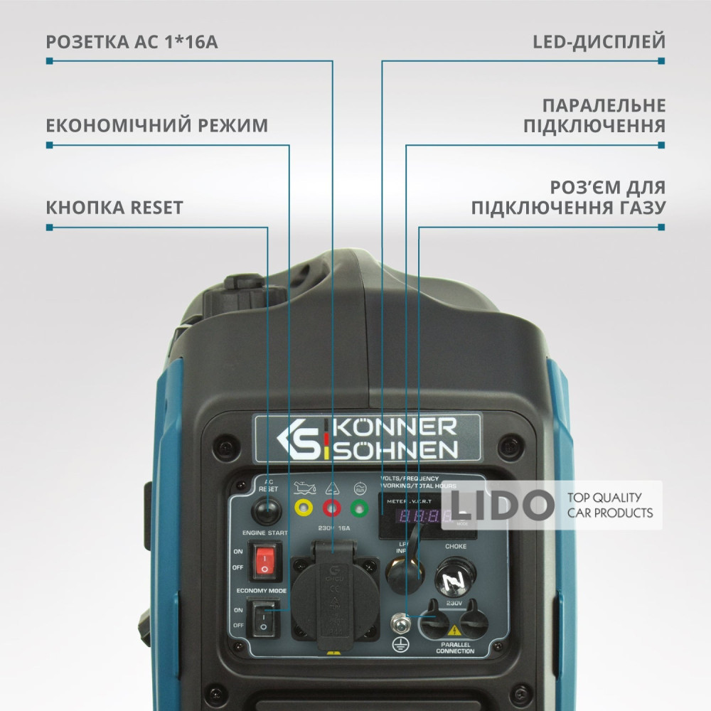 - LED дисплей: счетчик моточасов, частота, вольтаж