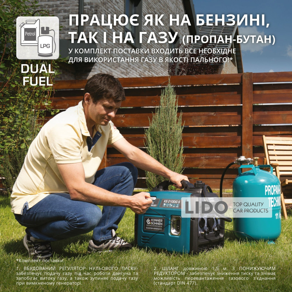 - Универсальное питание с двойным топливом: работа на бензине и газе (пропан-бутан). Все необходимое для подключения к газовому баллону входит в комплект.