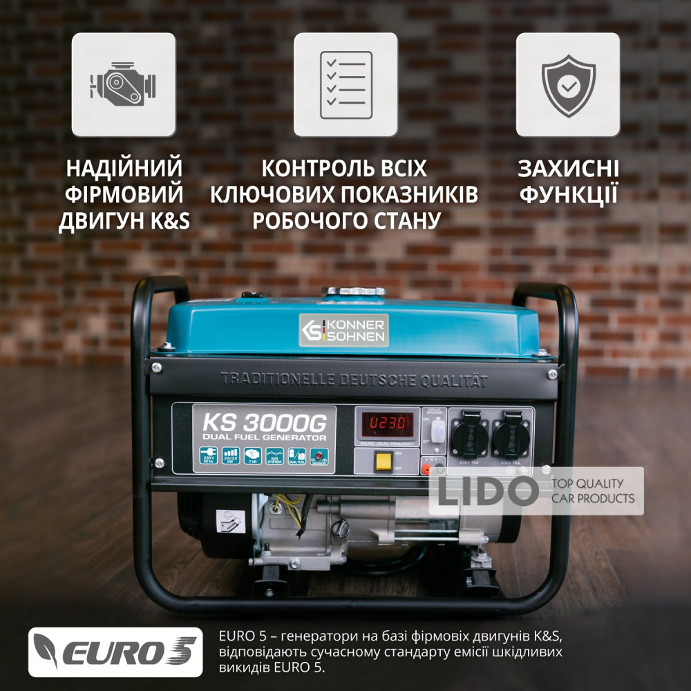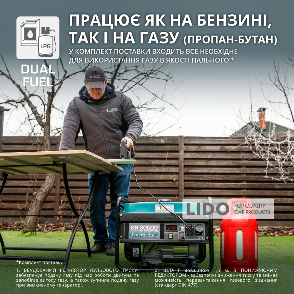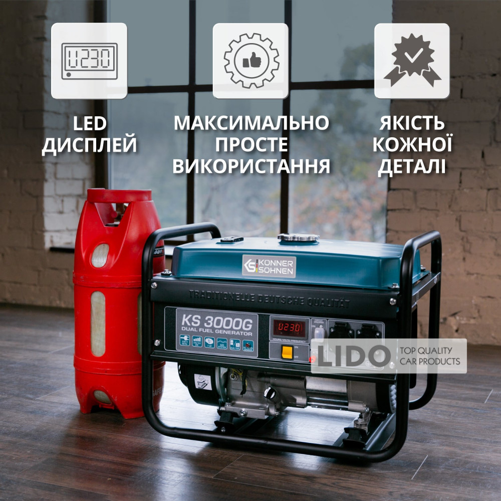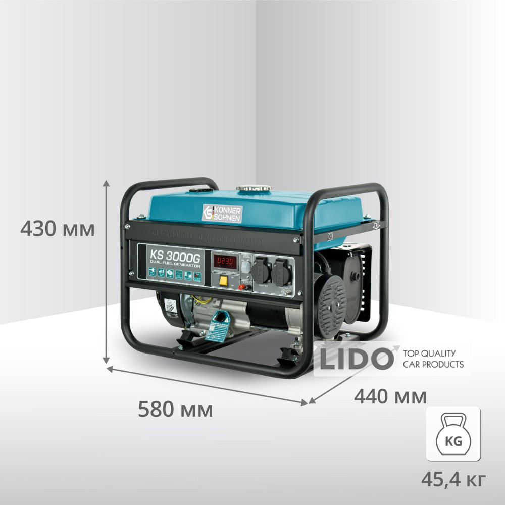 - Простой запуск и надежная работа: генераторы Könner & Söhnen оснащены всем необходимым для подключения газового баллона, а также имеют возможность запуска и работы только на газ, что делает их использование максимально удобным.