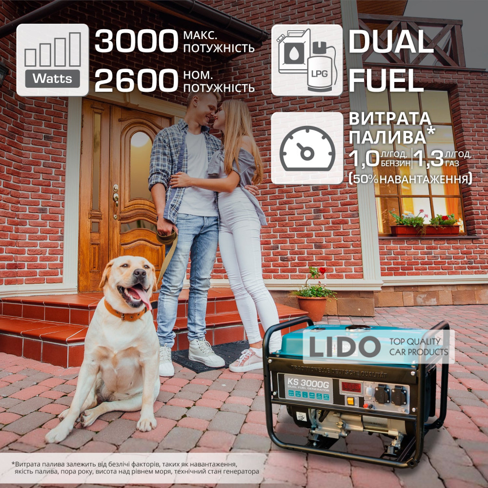 Использование газа в качестве топлива существенно снижает ваши расходы на топливо при эксплуатации устройства, а разница стоимости между бензиновым и гибридным генератором DUAL FUEL от K&S быстро себя окупает.