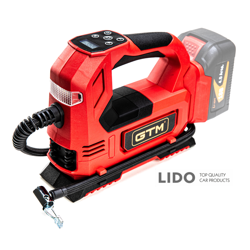 GTM AСC18/26 – компактный и легкий компрессор, предназначенный для накачки колес легковых автомобилей или внедорожников. Это мобильный высокопроизводительный компрессор без ресивера. Компрессор питается от стандартных аккумуляторов GTM 18В или прикуривателя автомобиля. При работе компрессор выдает 26 л/мин с рабочим давлением до 6.8 бара. Компрессор поставляется с набором аксессуаров для полноценной работы.