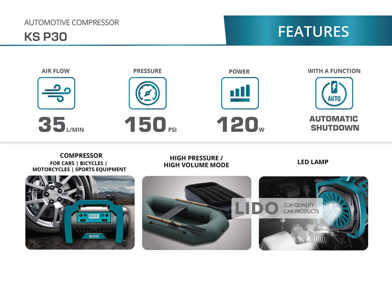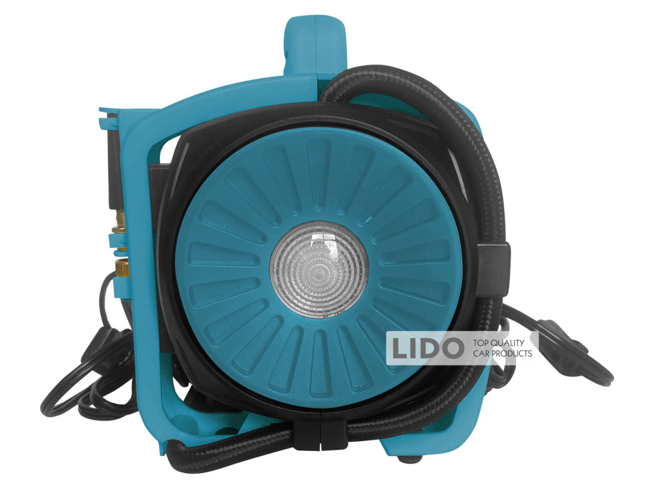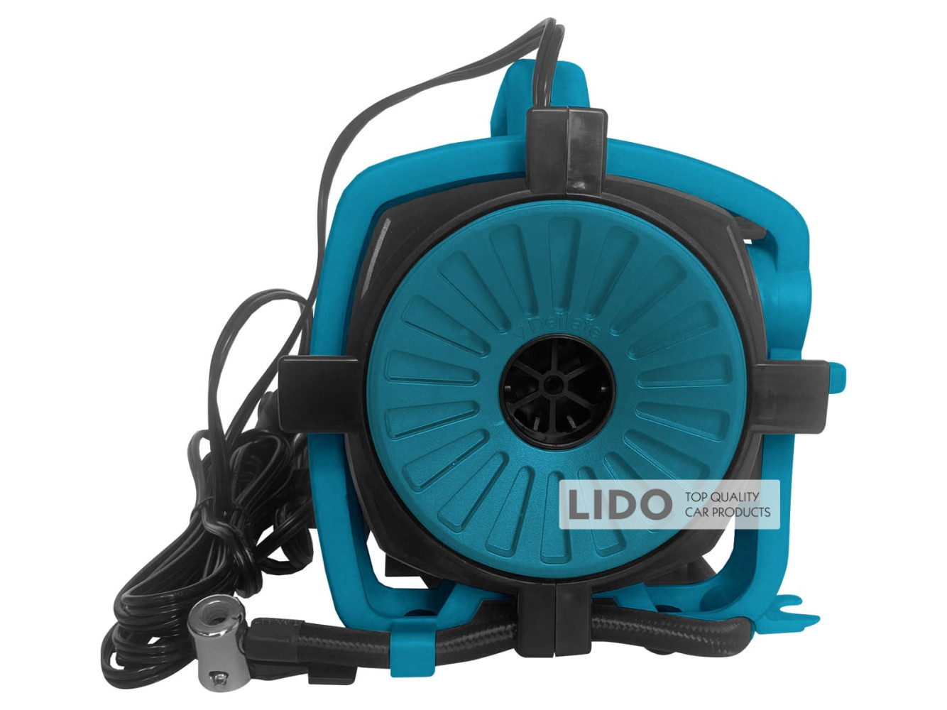 Компрессор имеет шланг высокого давления, шланг высокой пропускной способности и коническую насадку высокой пропускной способности, что позволяет быстро накачивать предметы больших объемов - надувные лодки, бассейны и т.д. -