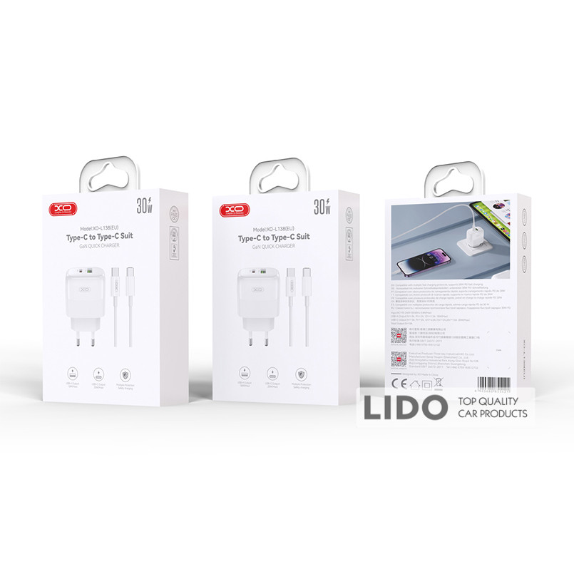 Сетевое зарядное устройство для XO L138 PD30W/QC18W (1 USB-A + 1 USB-C) + Lightning кабель (белый)