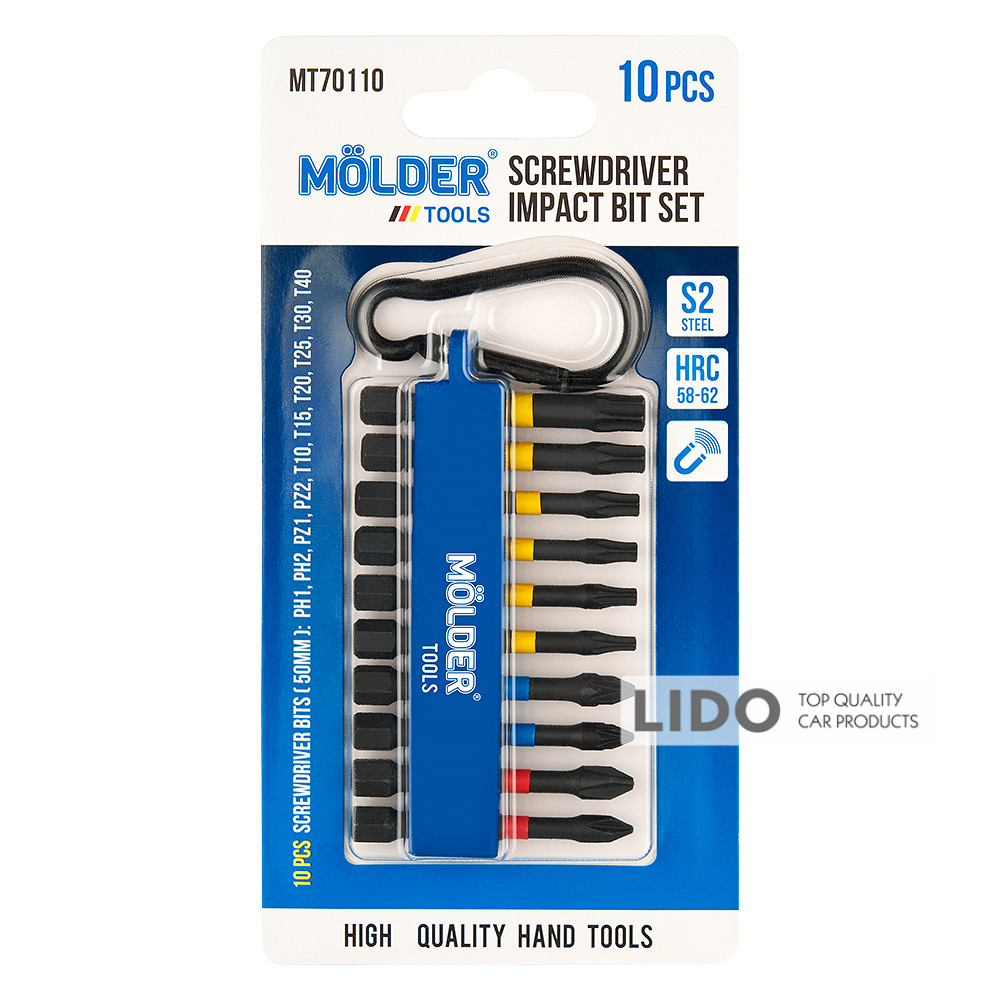 Набор ударных бит MOLDER 50 мм (10 шт, цветная маркировка) — профессиональный комплект, разработанный для использования с ударными шуруповертами и гайковертами. Биты обладают повышенной прочностью, устойчивостью к деформациям и долговечностью благодаря специальной закалке и материалу S2.