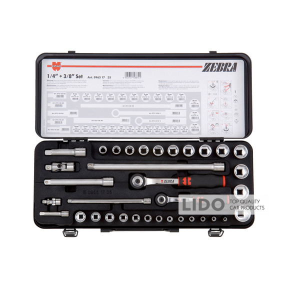 Набор содержит 35 предметов с торцевыми ключами на 1/4" и 3/8" в металлической кассете.