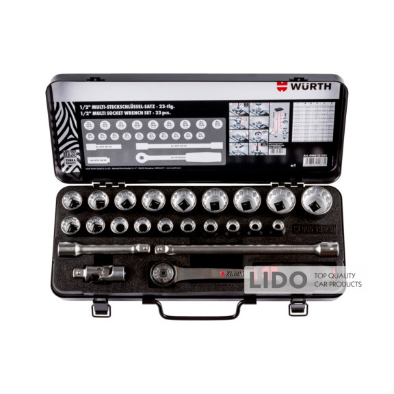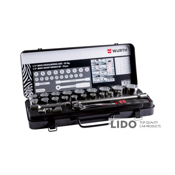 19 головок 1/2 дюйма, короткие, размеры 10, 11, 12, 13, 14, 15, 16, 17, 18, 19, 20, 21, 22, 24, 26, 27, 28, 30, 3 2 удлинители 1/2 дюйма, 125 мм, 250 мм, 1 карданный шарнир 1/2 дюйма.