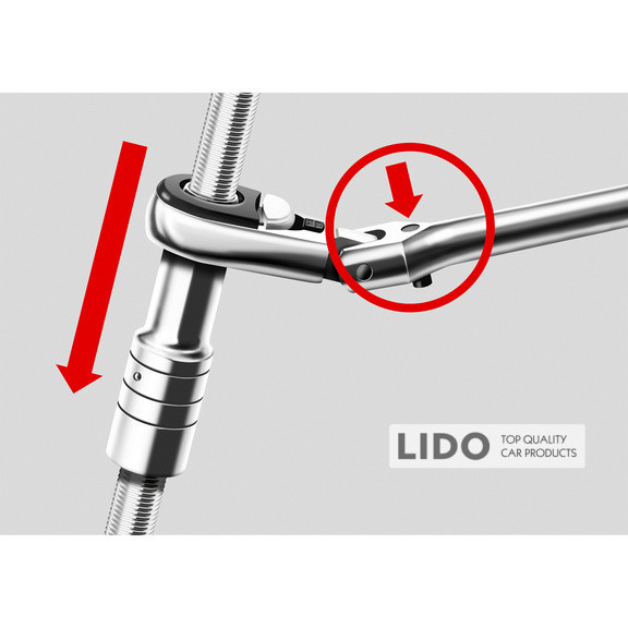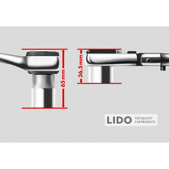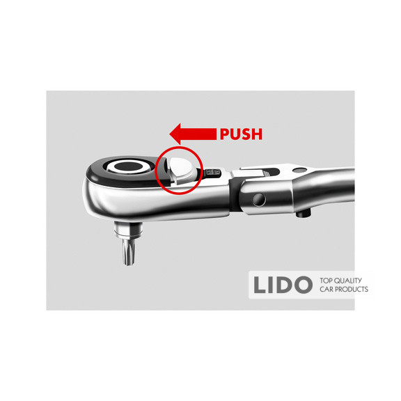 Головка трещотки оснащена храповиком на 72 зуба и небольшой толщиной, что вместе с шарниром позволяет доставать крепеж в труднодоступных местах.