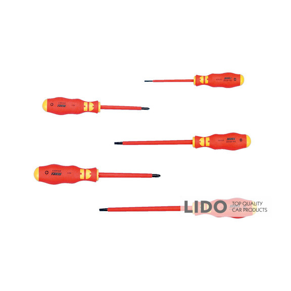 Набор отверток 5 шт. Проверен в соответствии с требованиями Союза немецких электротехников (VDE) и сертифицирован для работы под напряжением до 1000 В. Имеет сертификат безопасности GS, подтверждающий высокое качество и соответствие европейским стандартам безопасности.