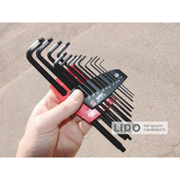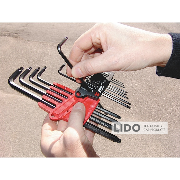 Г-образные, полностью закаленные (до вязкой жесткости). Длинный стержень со стопорной пружиной. TX6 для надежной фиксации винта Torx.