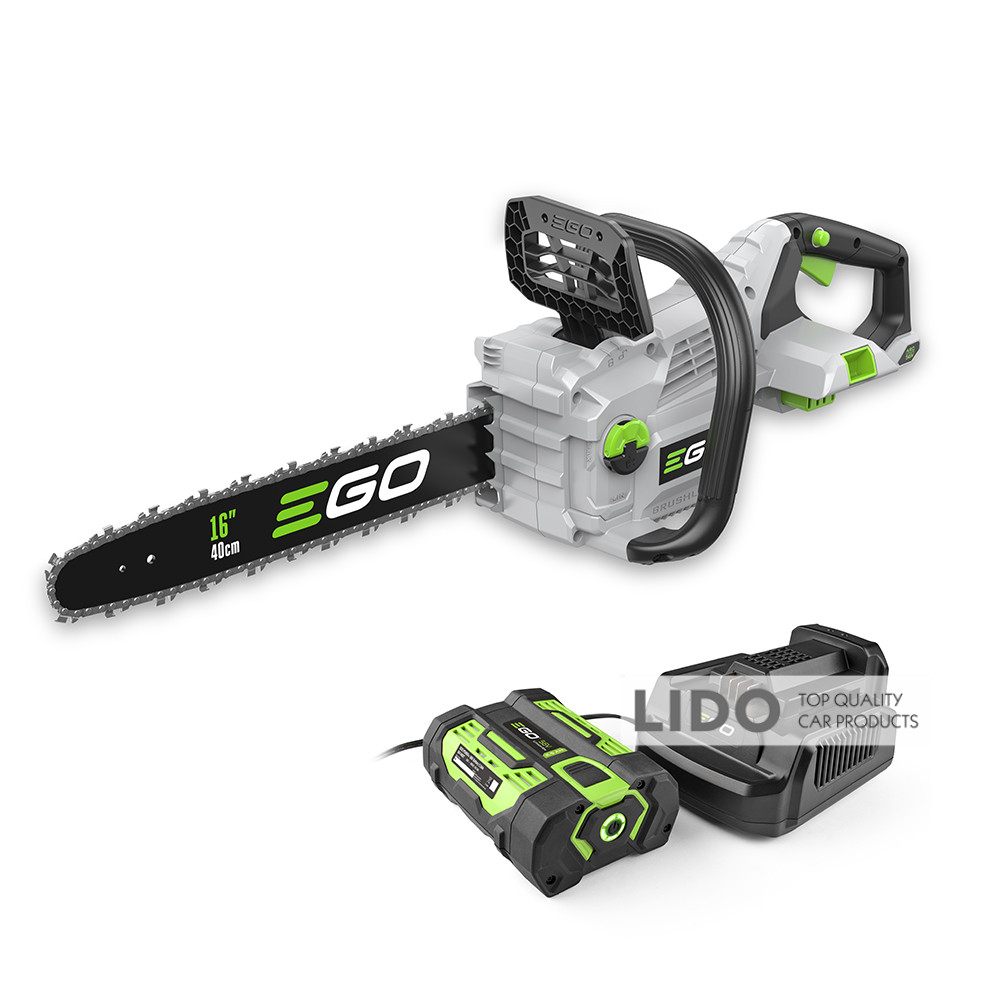 EGO CS1614E — компактная и мощная электропила бытового класса для домашнего использования. Оборудованная безщеточным двигателем, питается от Li-Ion аккумулятора 56 В. Пила комплектуется шиной 40 см/16" и цепью 3/8" со скоростью 20,5 м/с. Для безопасности пользователя имеется защитный щиток с механическим тормозом.