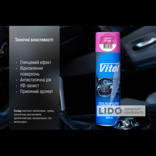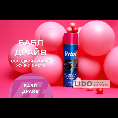 Полироль VITOL – это не просто средство по уходу за поверхностями, а настоящее настроение в дороге. Благодаря свежему сладковатому аромату «жвачки», салон автомобиля наполняется легкостью, стилем и чистотой. Универсальная формула полирует, очищает и защищает пластик, винил, резину и даже деревянные вставки. После обработки образуется антистатический слой, защищающий от пыли, УФ-излучения и пересыхания.