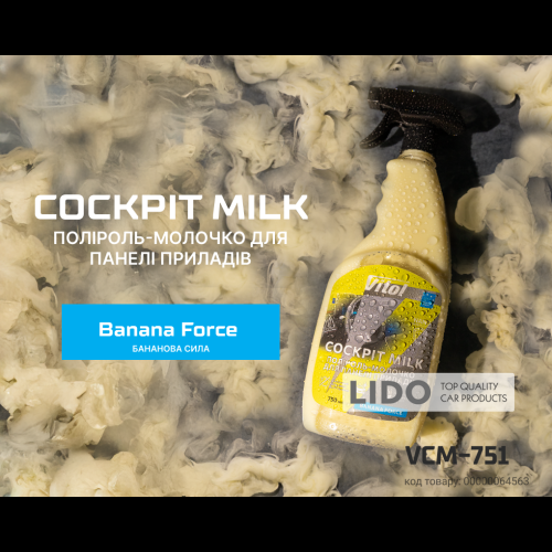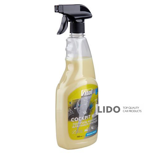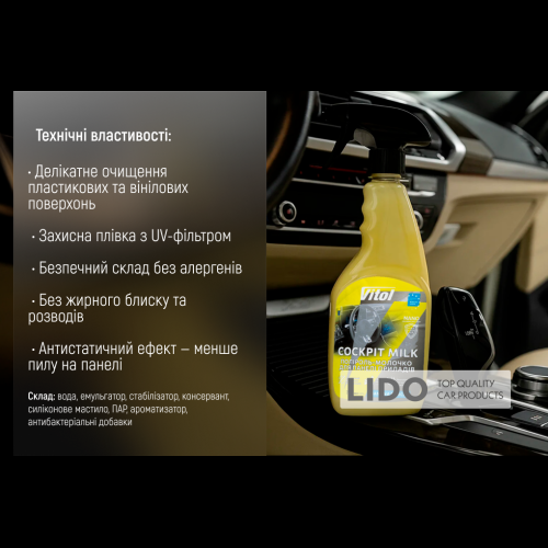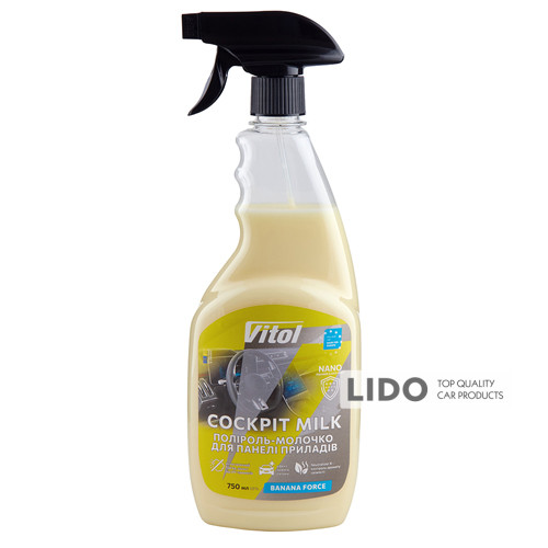 VITOL Cockpit Milk — эффективное полироль-молочко для очистки и ухода за пластиковыми элементами салона. Средство деликатно очищает, придает умеренный блеск, создает антистатический барьер и приятно ароматизирует интерьер. Формат 750 мл с распылителем подходит для частного использования и СТО.