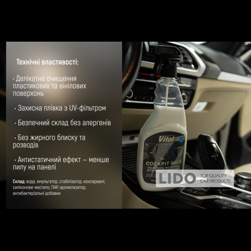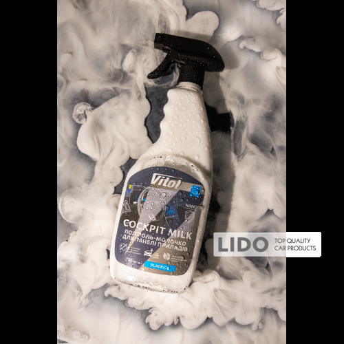 VITOL Cockpit Milk — эффективное полироль-молочко для очистки и ухода за пластиковыми элементами салона. Средство деликатно очищает, придает умеренный блеск, создает антистатический барьер и приятно ароматизирует интерьер. Формат 750 мл с распылителем подходит для частного использования и СТО.