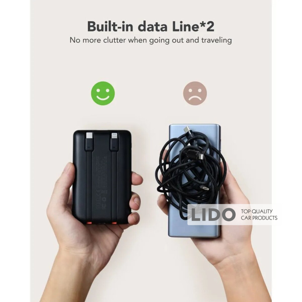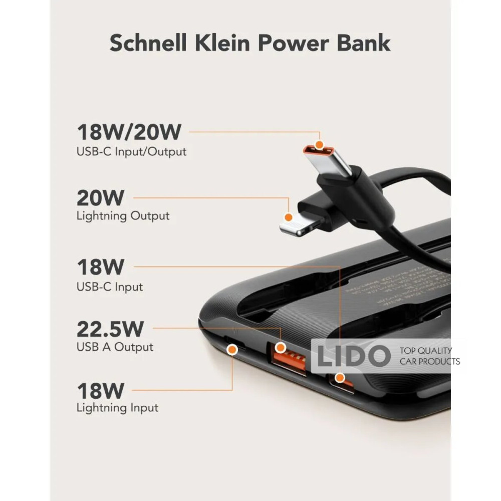 Аккумулятор оснащен выходным портом USB-A мощностью 22,5 Вт, двумя входными портами. USB-C 18 Вт и Lightning 18 Вт, а также двумя встроенными кабелями Lightning 20 Вт и USB-C 20 Вт. Интеллектуальная система защиты предохраняет устройства от перезарядки, перенапряжения, перегрузки по току и короткого замыкания.