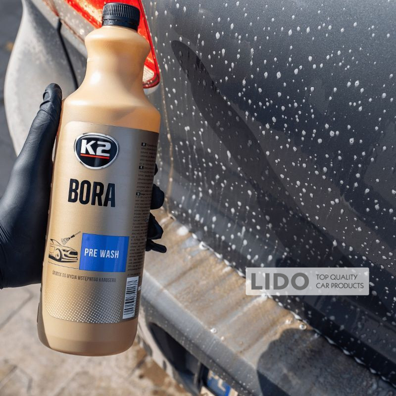 Средство для предварительной мойки кузова K2 PRO BORA M803 — концентрат типа pre-wash, эффективно размягчающий дорожный налет и грязь перед основной мойкой, повышая результативность дальнейшей очистки.