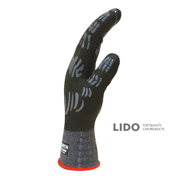 - Дышащая перчатка с нитриловым покрытием и дополнительными нитриловыми полосками с обеих сторон
