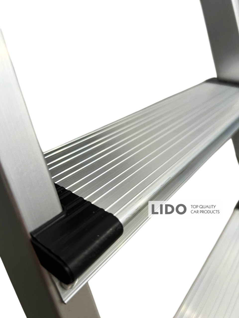 Имеет клепаное соединение ступенек с боковинами профиля и прочную металлическую платформу с антискользящим профилем. Надежные антискользящие упоры обеспечивают безопасность при работе.