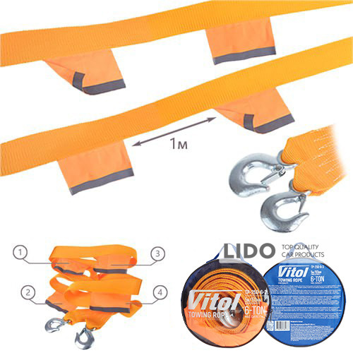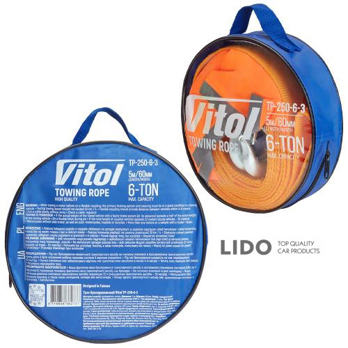 Трос буксировочный Vitol 6т лента 60ммх5м оранж/2 крюка/флажки/сумка