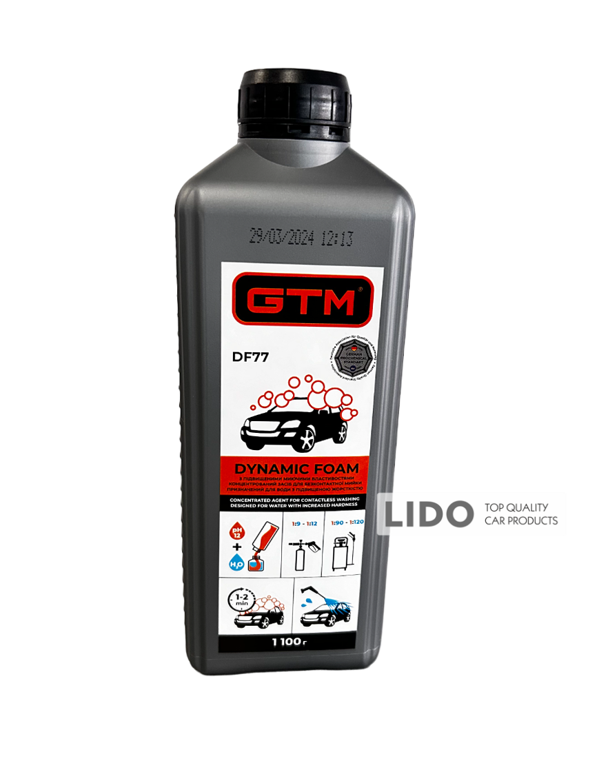 GTM Dynamic Foam DF77 – високоефективний засіб для очищення поверхні від забруднень усіх видів. Відноситься до преміального сегменту активної піни та виділяється підвищеною миючою здатністю завдяки збільшеній концентрації хімічно активних речовин. Застосовується для всіх видів безконтактного миття автомобілів, велосипедів та мотоциклів. Надає поверхні блиск без розводів. Піна безпечна для лакофарбового покриття, пластмас, гуми та металів.