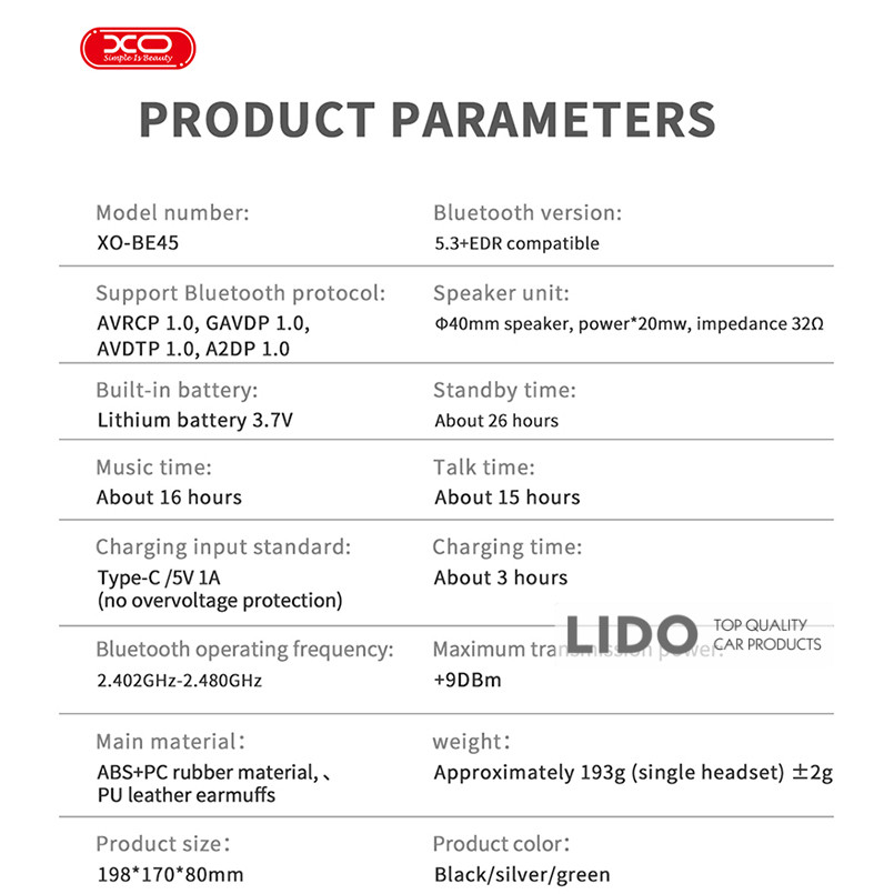 Навушники XO BE45 — це стильний та функціональний пристрій для поціновувачів якісного звуку. Завдяки бездротовій технології Bluetooth навушники забезпечують стабільне з'єднання з вашим пристроєм і дозволяють насолоджуватися музикою, подкастами або дзвінками без зайвих дротів.