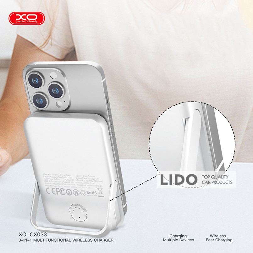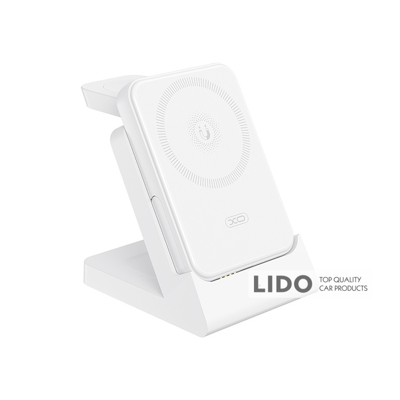 XO CX033 Wireless Charger 3‑в‑1 – універсальна зарядна станція з Power Bank, яка дозволяє одночасно заряджати смартфони, Apple Watch та бездротові навушники. Ідеальне рішення для дому, офісу та подорожей.