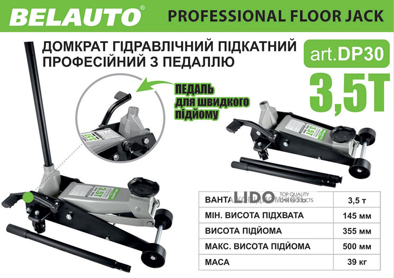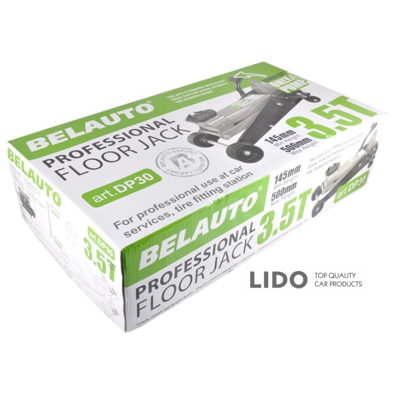Гідравлічний підкатний домкрат Belauto DP30 - універсальний вантажопідйомний механізм, призначений для підйому, утримання і фіксації автомобіля, в процесі проведення ремонтних і діагностичних робіт. Модель DP30 підкатного типу, має максимальну вантажопідйомність 3,5 тонни, що цілком достатньо для легкового автомобіля.