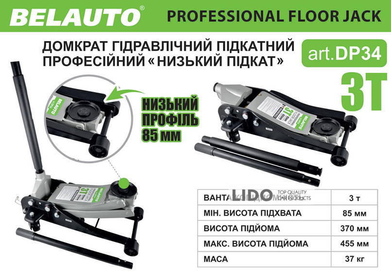Гідравлічний підкатний домкрат Belauto DP34 – універсальний вантажопідйомний механізм, призначений для підйому, утримання і фіксації автомобіля, в процесі проведення ремонтних і діагностичних робіт.
