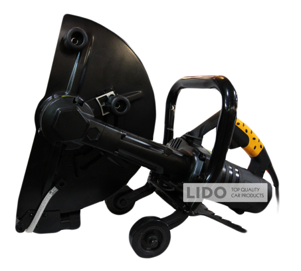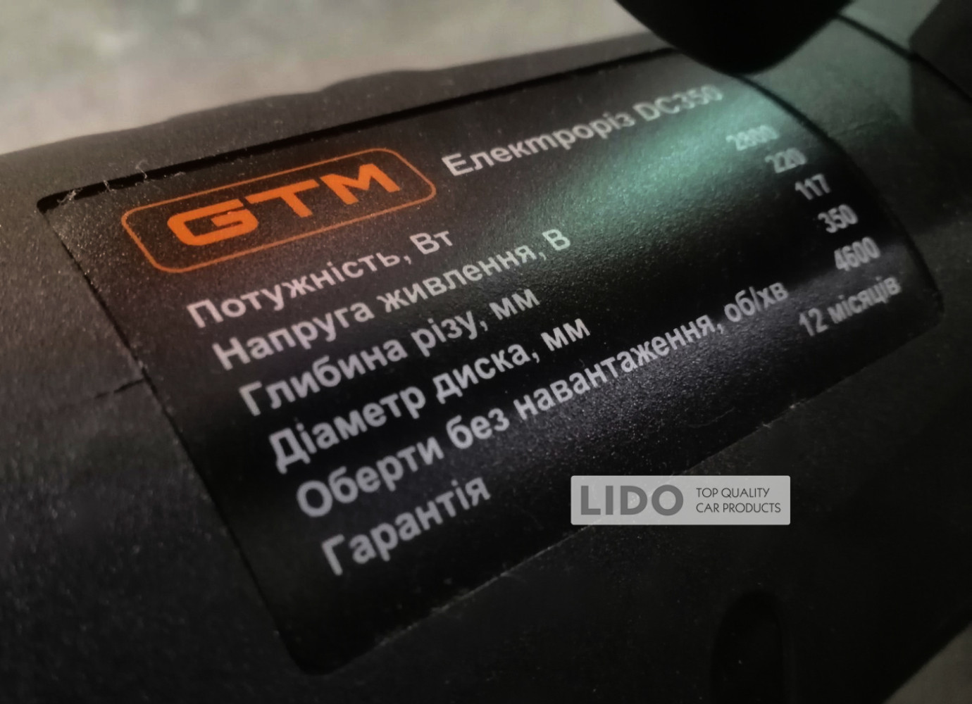 Електроріз GTM DC350 призначається для різання цегляних, бетонних, залізобетонних та інших конструкцій за допомогою алмазного диска. На інструмент встановлюється стандартний алмазний круг діаметром 355 мм з посадковим отвором 25,4 мм. Глибина різу регулюється спеціальною планкою і досягає 117 мм. Двигун потужністю 2800 Вт забезпечує швидкість обертання диска до 4800 об/хв. Ротор і статор двигуна додатково броньовані поліамідною ниткою для захисту від пилу та підвищення ресурсу. Щітки двигуна можна замінити без повного розбору корпусу. Для роботи з алмазними дисками використовується водяне охолодження, у комплекті йде мінінасос потужністю 30 Вт з продуктивністю 8 л/хв та трубка для подачі води. Для дисків, які ріжуть без подачі води, передбачений адаптер для підключення будівельного пилососа.