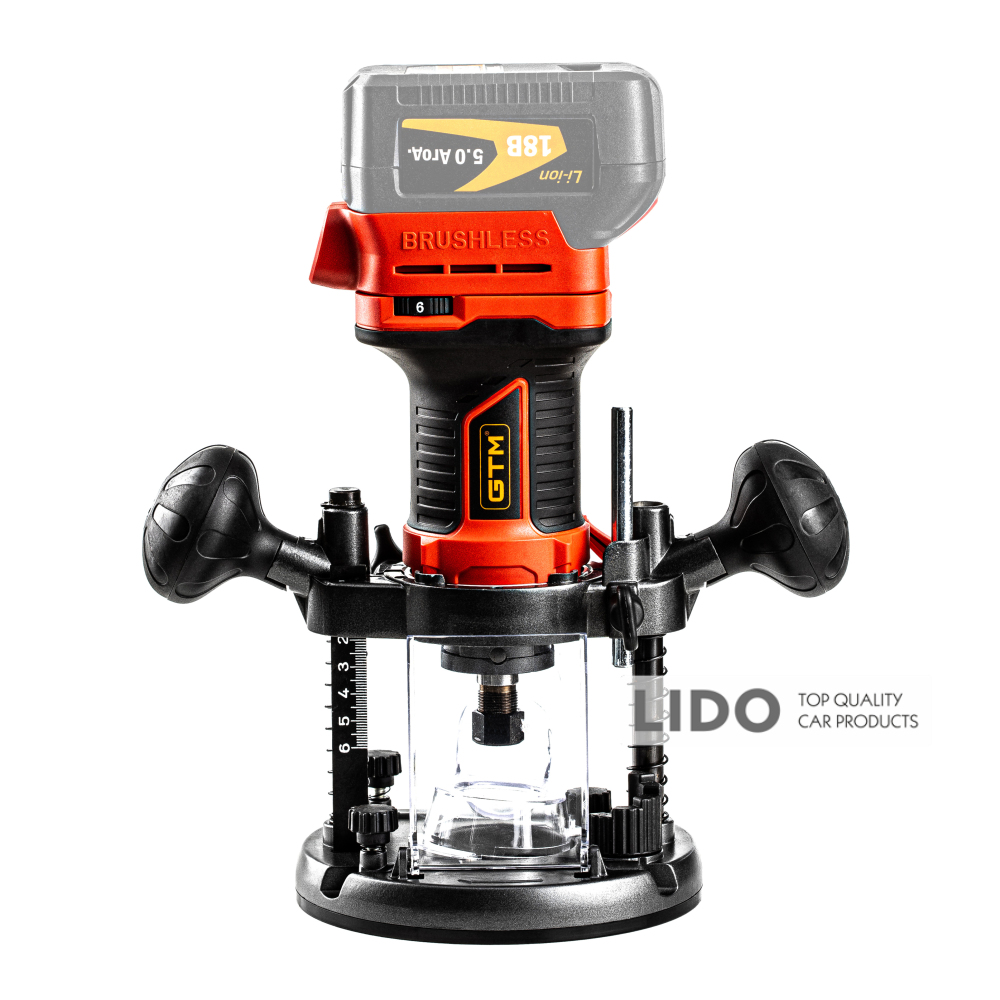 GTM R18/55BL - потужний інструмент для обробки дерева, що працює від стандартних акумуляторів GTM 18V. Конструкція дозволяє використовувати його як вертикальний, так і кромочний фрезер. Вбудований продуктивний безщітковий двигун забезпечує ефективне використання заряду акумулятора. Регульована цанга дозволяє застосовувати фрези з хвостовиком 6 мм і 8 мм.
