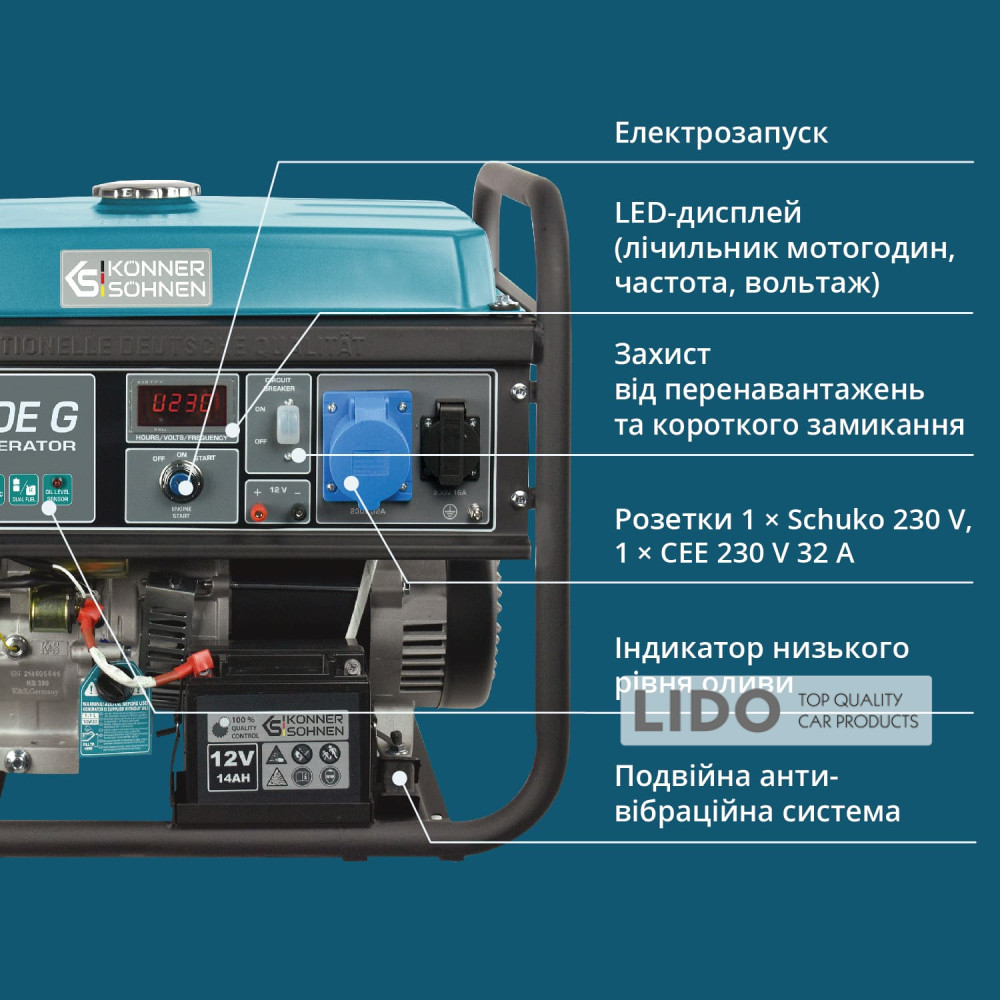 Кожний двигун має індивідуальний серійний номер, що дозволяє контролювати якість виробництва та сервісного обслуговування. Двигуни Könner & Söhnen вирізняються легким стартом та пониженою вібрацією. Лінійка бензинових генераторів KS 2900 оснащена надійним 1-циліндровим двигуном потужністю 6.5 к.с. -