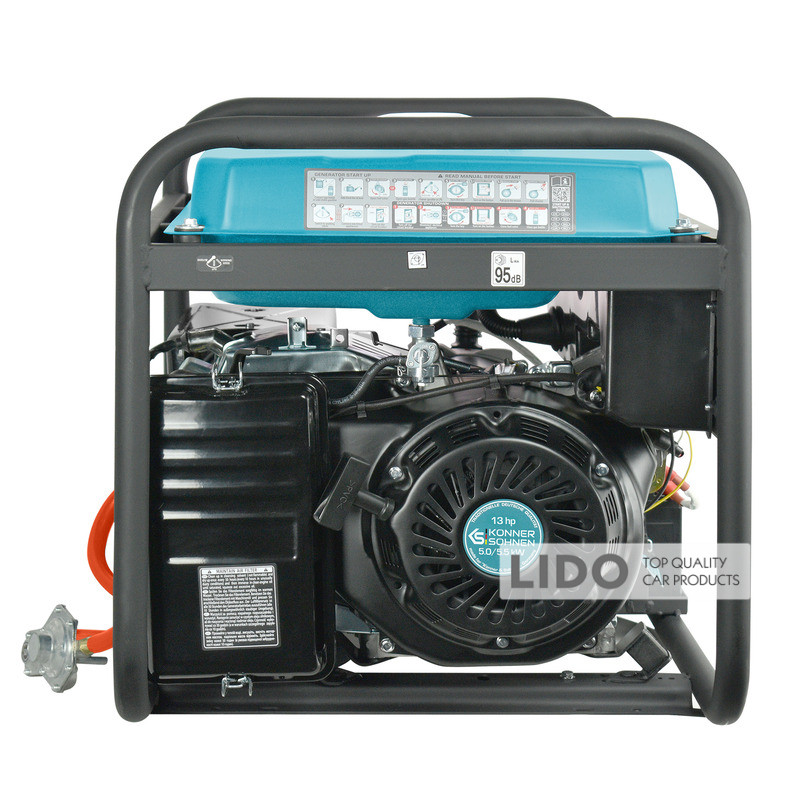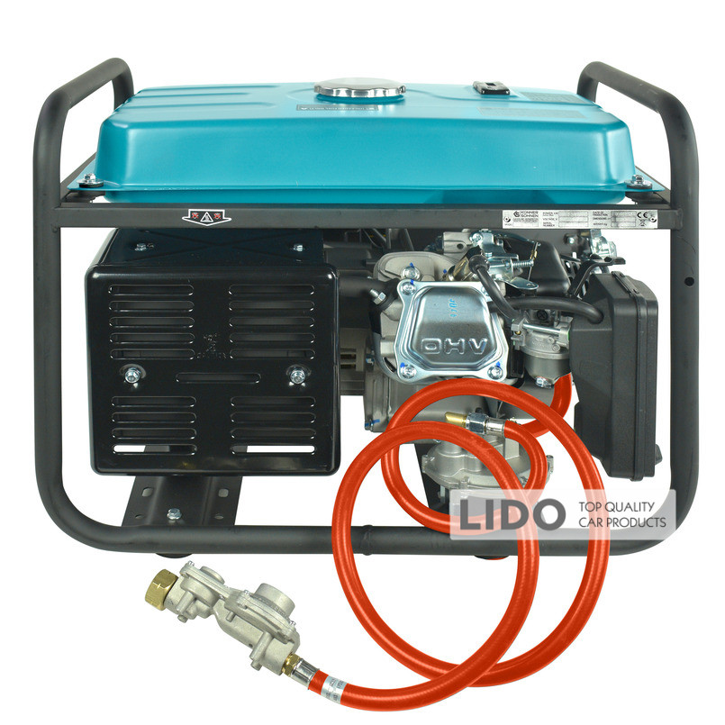 3. Для підвищення надійності газової магістралі на шланг встановлений понижуючий редуктор, який кріпиться на балон (стандарт DIN 477). Він забезпечує зниження тиску та знімає можливість перевантаження газового з’єднання. Потрібно лише під’єднати генератор до балону та запустити двигун.