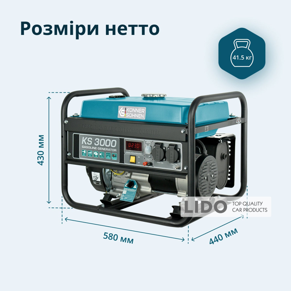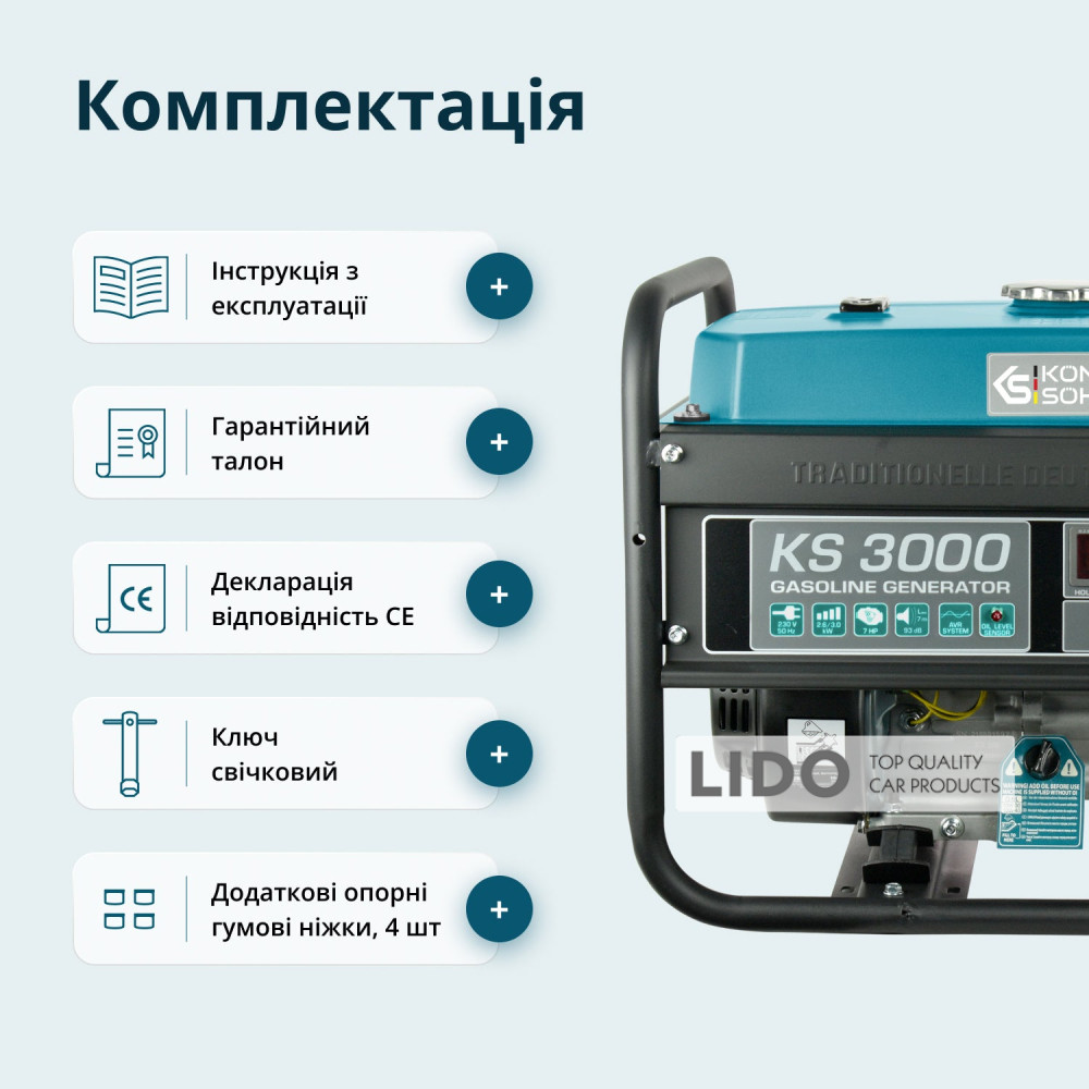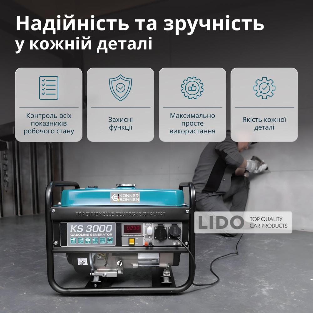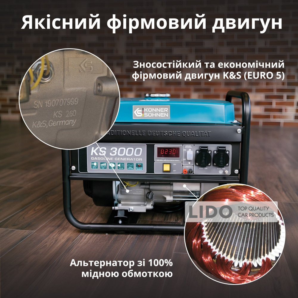 Двигуни Konnern Sohnen вирізняються легким стартом та пониженою вібрацією. Лінійка бензинових генераторів KS 3000 оснащена надійним 1-циліндровим двигуном потужністю 7 к.с.