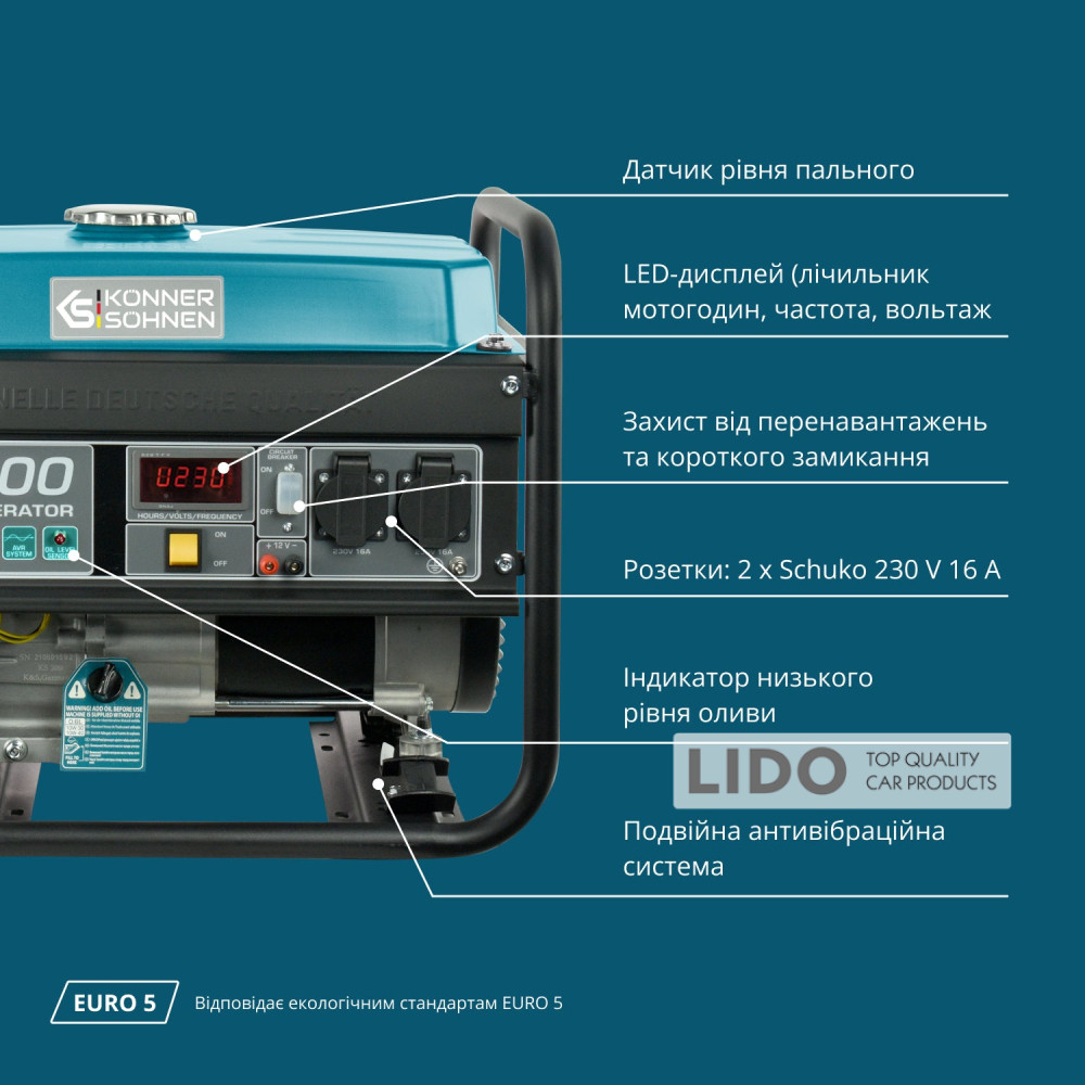 Генератори «Konner Sohnen» оснащені сталевим паливним баком збільшеного розміру, що подовжує час роботи без дозаправки. На баці розміщений індикатор рівня палива.