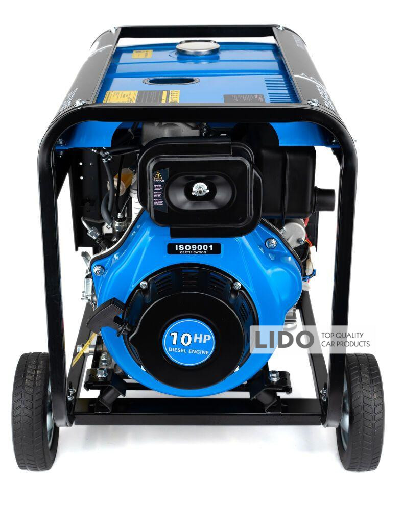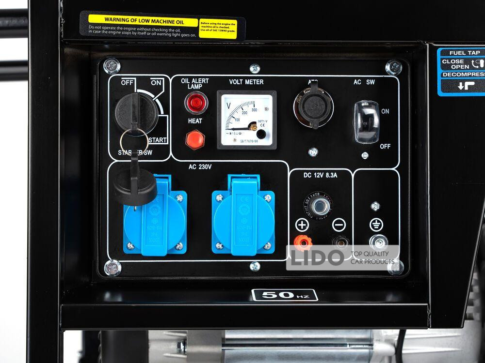 Двигун потужністю 7,35 кВт/10 к.с. забезпечує потужний тяговий імпульс, що дозволяє легко запустити прилади з високим пусковим струмом. Паливний бак об’ємом 12,5 л дозволяє безперервну експлуатацію до 8 годин на одній заправці. Завдяки електростартеру генератор легко запускається в будь-яких погодних умовах. Захист від перевантаження та датчик рівня мастила запобігають виникненню несправностей. Для зручності експлуатації цей дизельний генератор для дому має колеса і ручку.