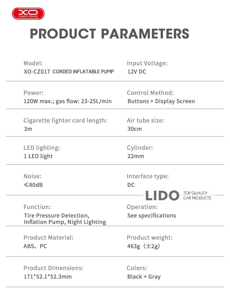 XO CZ017 — портативний компресор, незамінний помічник для швидкого накачування шин та інших надувних виробів у будь-яких умовах. Компактний і функціональний, він стане ідеальним доповненням до твого автомобіля.
