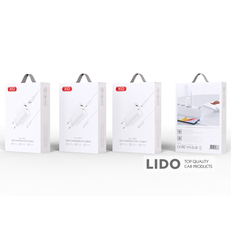 Мережевий зарядний пристрій XO L114 PD20W/QC18W + Lightning кабель (білий)