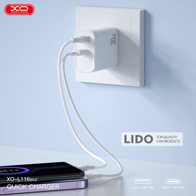 Мережевий зарядний пристрій XO L116 PD30W/QC18W 1USB-C+1USB-A Type-C кабель білий