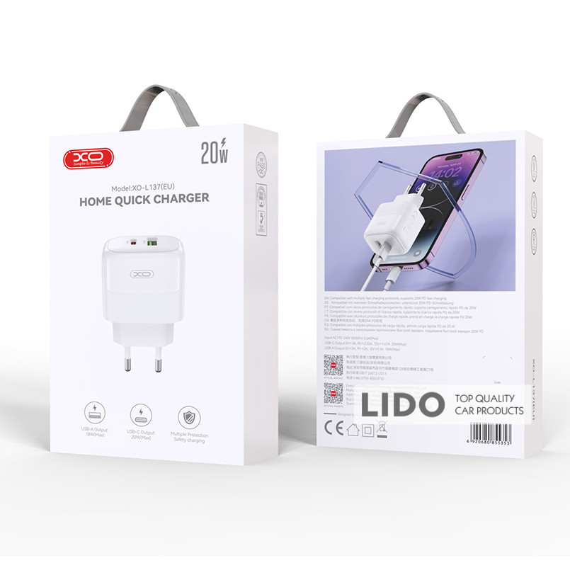 Мережевий зарядний пристрій XO L137 — сучасний, компактний і універсальний адаптер для швидкої зарядки смартфонів, планшетів та інших USB-пристроїв. Завдяки підтримці технологій Power Delivery (PD) та Quick Charge (QC) він забезпечує ефективну та безпечну зарядку як пристроїв Apple, так і Android.