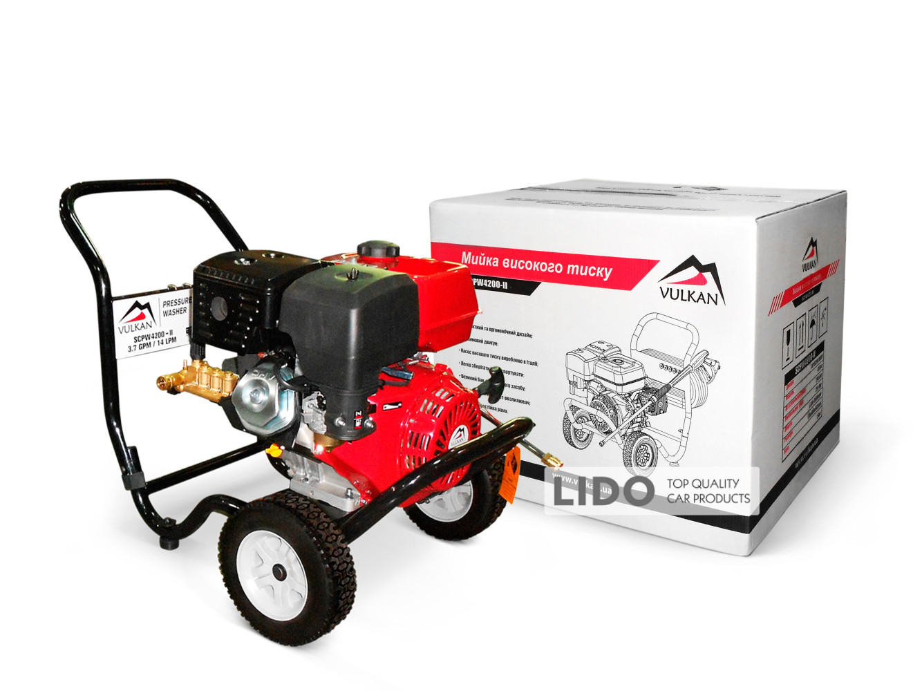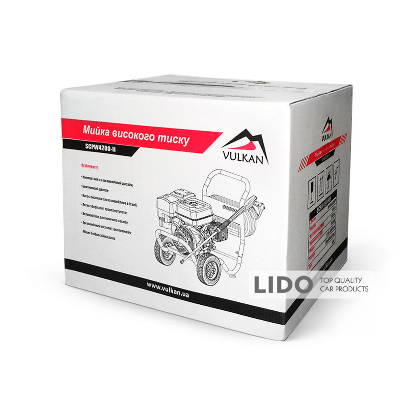 Мийка високого тиску Vulkan SCPW 4200-II — професійний мийний апарат на бензиновому двигуні потужністю 13 к.с. Модель активно застосовується у сфері технічного обслуговування, на виробництві, у роботі комунальних служб та клінінгових компаній. За потреби мийку можна оснастити пінною насадкою або фрезою.