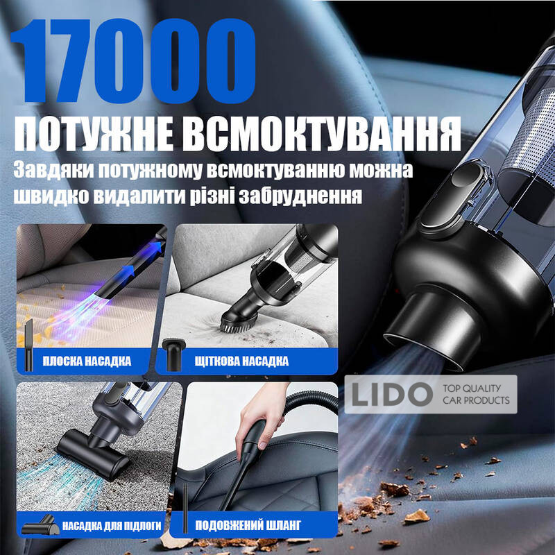 Пилосос працює з рівнем шуму до 75 дБ, що дозволяє використовувати його навіть під час поїздки, не відволікаючи водія чи пасажирів.