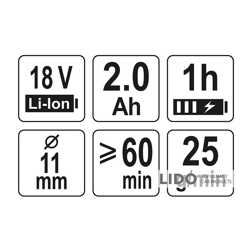 - Сумісність із запасними акумуляторами ємністю 2 Агод (YT-82842), 3 Агод (YT-82843) та 4 Агод (YT-82844)