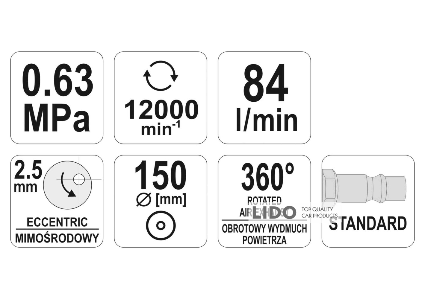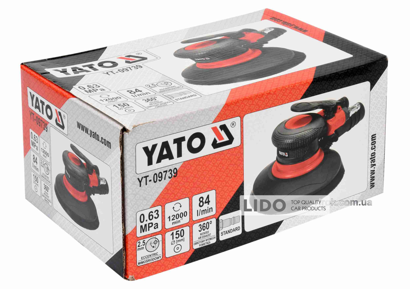 YATO YT-09739 — це ексцентрикова пневматична шліфмашина, яка працює від стисненого повітря. Інструмент призначений для шліфування та полірування різних матеріалів завдяки абразивним насадкам, що накладаються на диск. Застосовується в автосервісах та промислових умовах для ефективної обробки поверхонь.