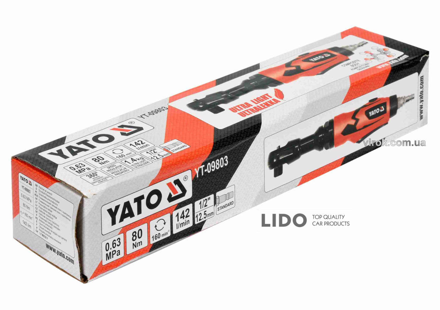 Ультралегка пневматична тріщатка YATO YT-09803 призначена для роботи під великим навантаженням на вулканізаційних і автомобільних заводах — для швидкого монтажу та демонтажу різьбових з'єднань і вузлів. Замінює тріщатки на ручному приводі, що скорочує час обслуговування і полегшує роботу в важкодоступних місцях.