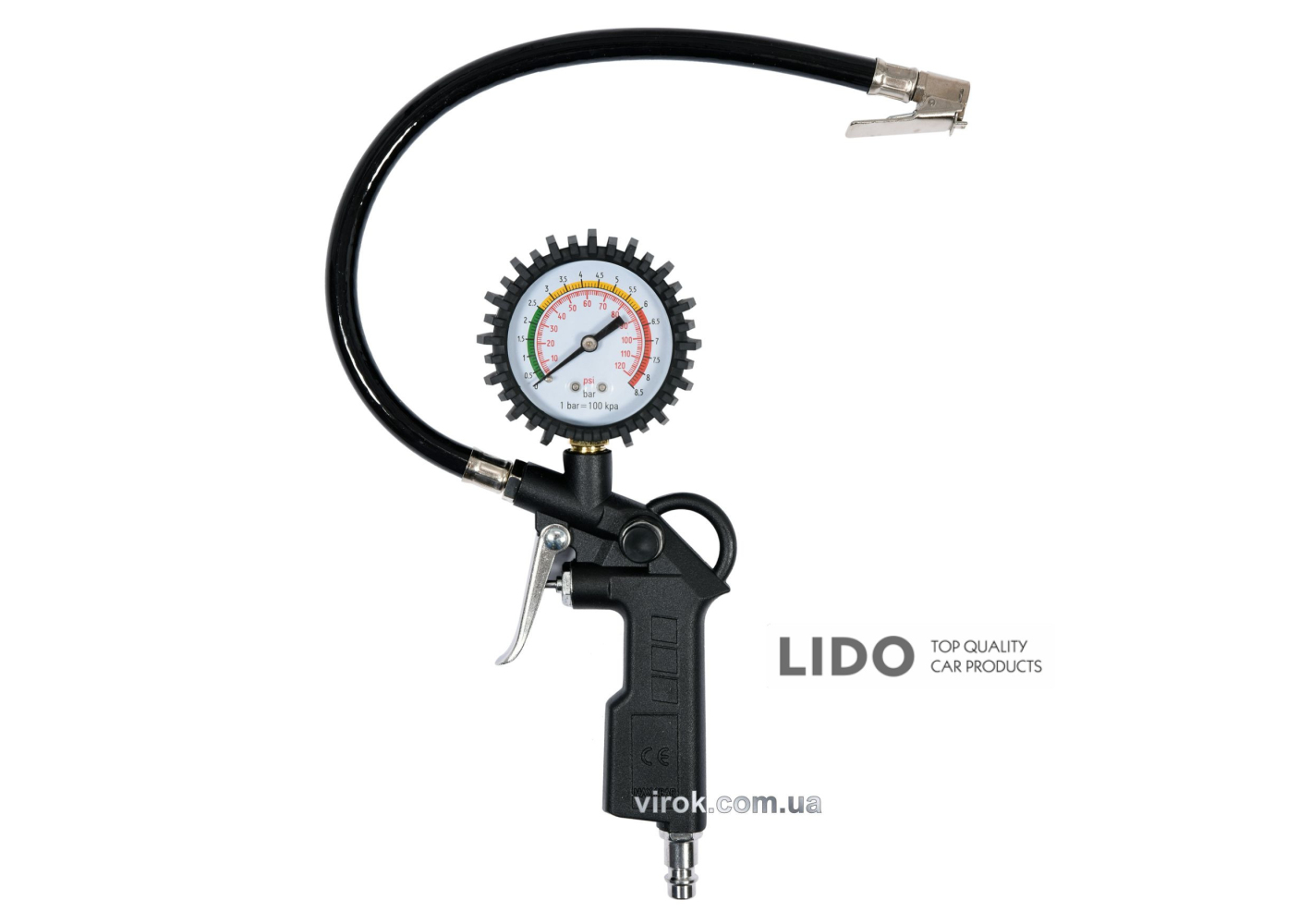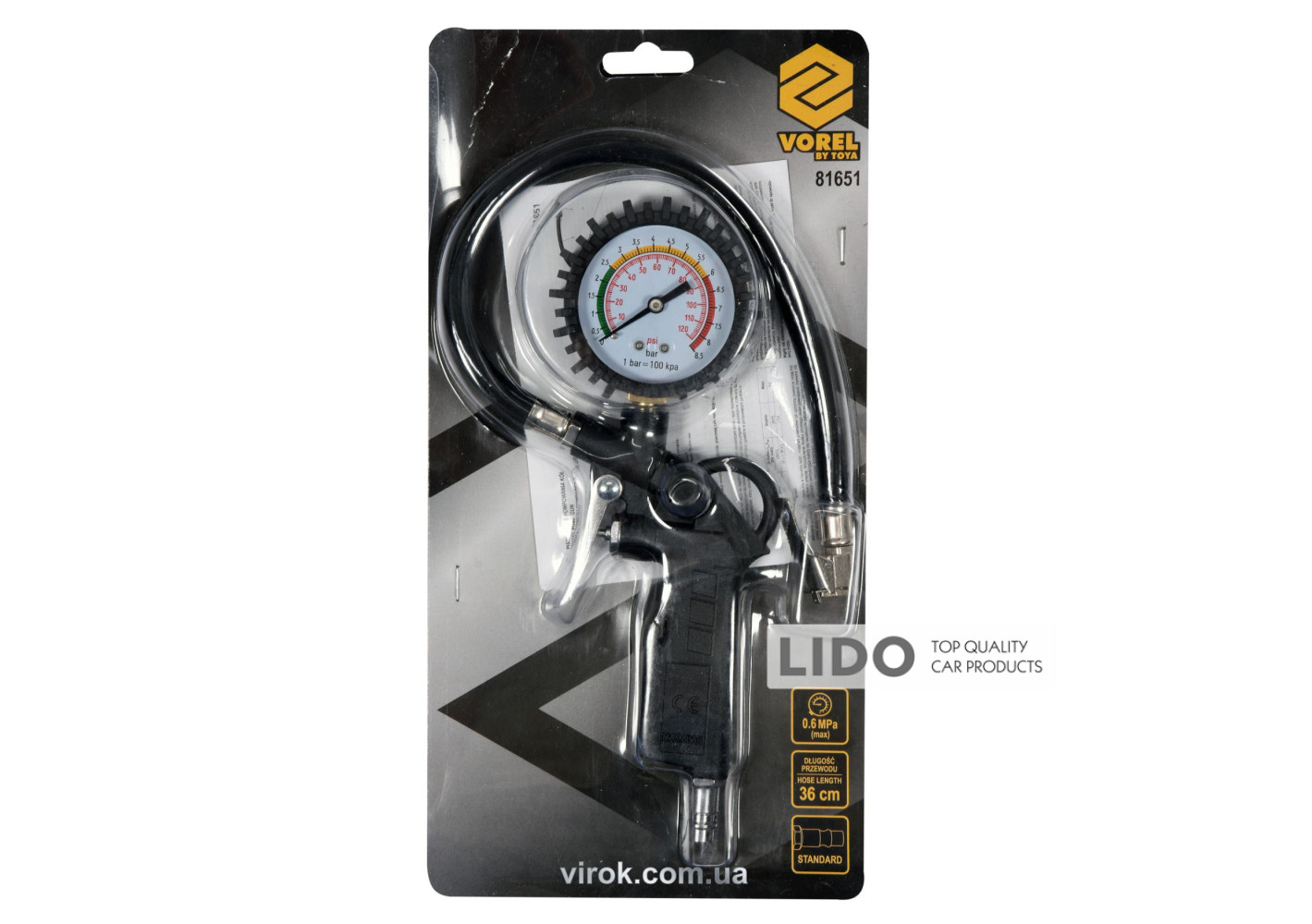 Пневмопістолет VOREL 81651 призначений для накачування коліс, а також дозволяє контролювати тиск при перекачуванні чи недостачі повітря. Має великий манометр, захищений від ударів.