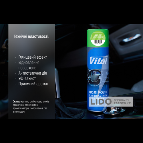 Матова поліроль VITOL підходить для догляду за внутрішніми елементами салону: панеллю приладів, дверними картами, підлокітниками та іншими пластиковими або вініловими поверхнями.